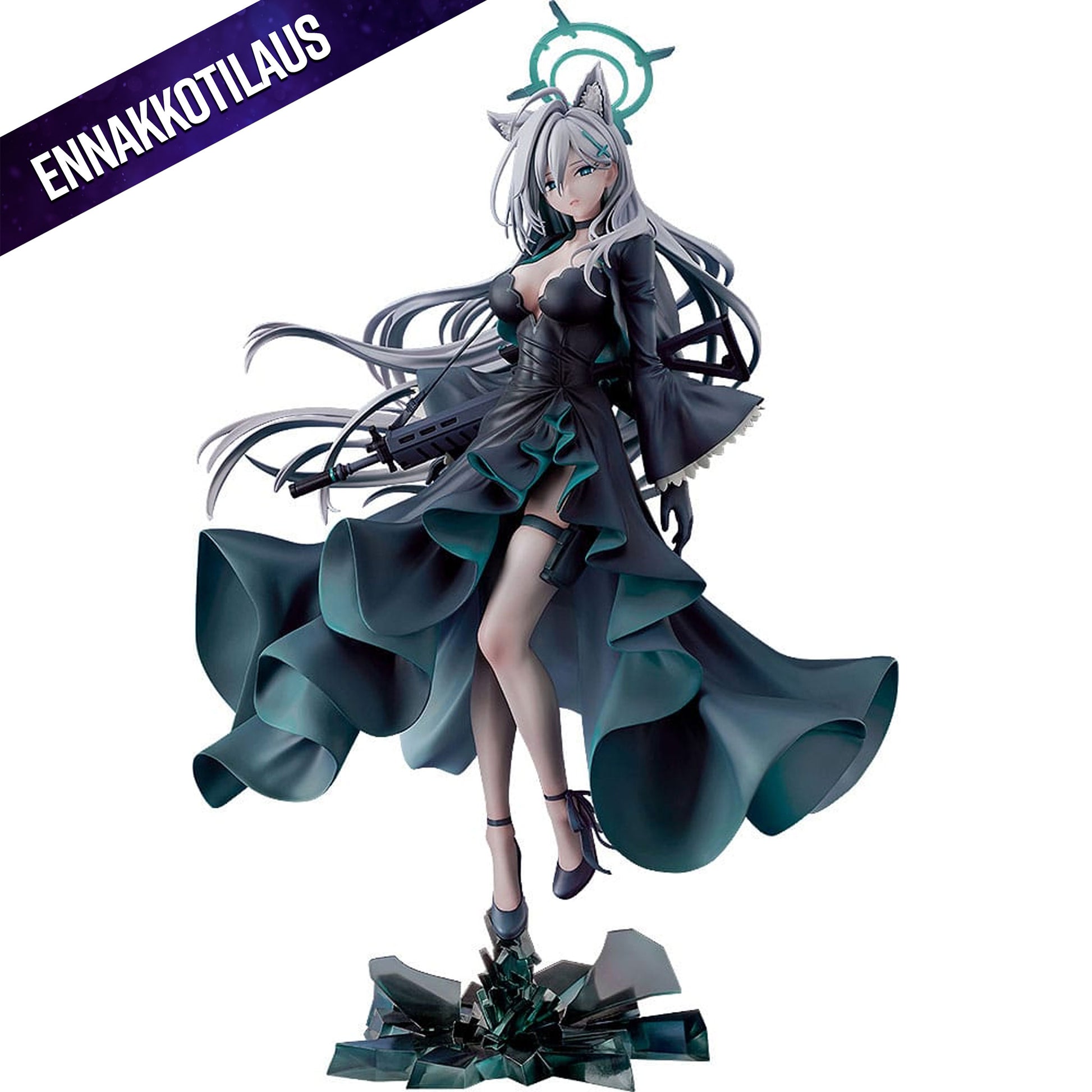 Suositusta "Blue Archive" -pelistä tulee Shiroko*Terrorin, toisesta maailmasta tulleen Shirokon, pienoishahmo! Hänen kiiltävän musta mekkonsa on kauniisti kontrastissa syvien laskosten ja kirkkaanvärisen vuorin kanssa, jotka yhdessä hulmuavien hopeanhohtoisten hiusten ja kylmän katseen kanssa luovat lyhytikäisen ja yksinäisen tunnelman. Hänen sädekehänsä, kypsä fysiikkansa ja rynnäkkökiväärinsä, BLACK FANG 465, on tallennettu uskollisesti hahmon muotoon. Muista lisätä Shirokon julman kohtalon ja hiljaisen päättäväisyyden personifikaatio kokoelmaasi!